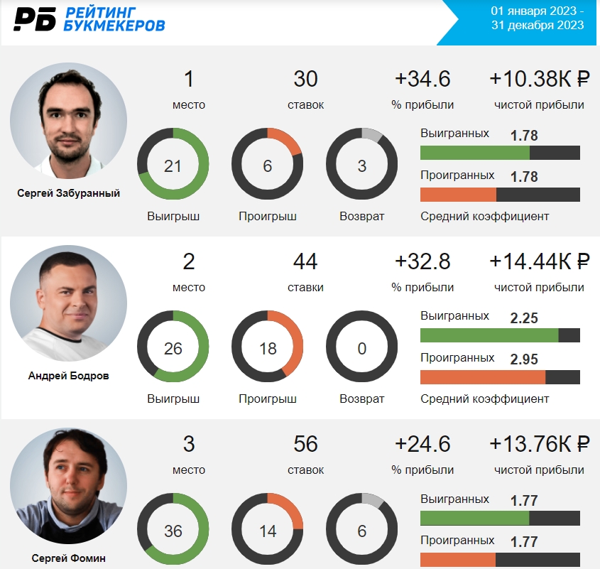 В 2023 году стал лучшим прогнозистом «Рейтинга Букмекеров», показав результат в 34,6% прибыли с 30 ставок.