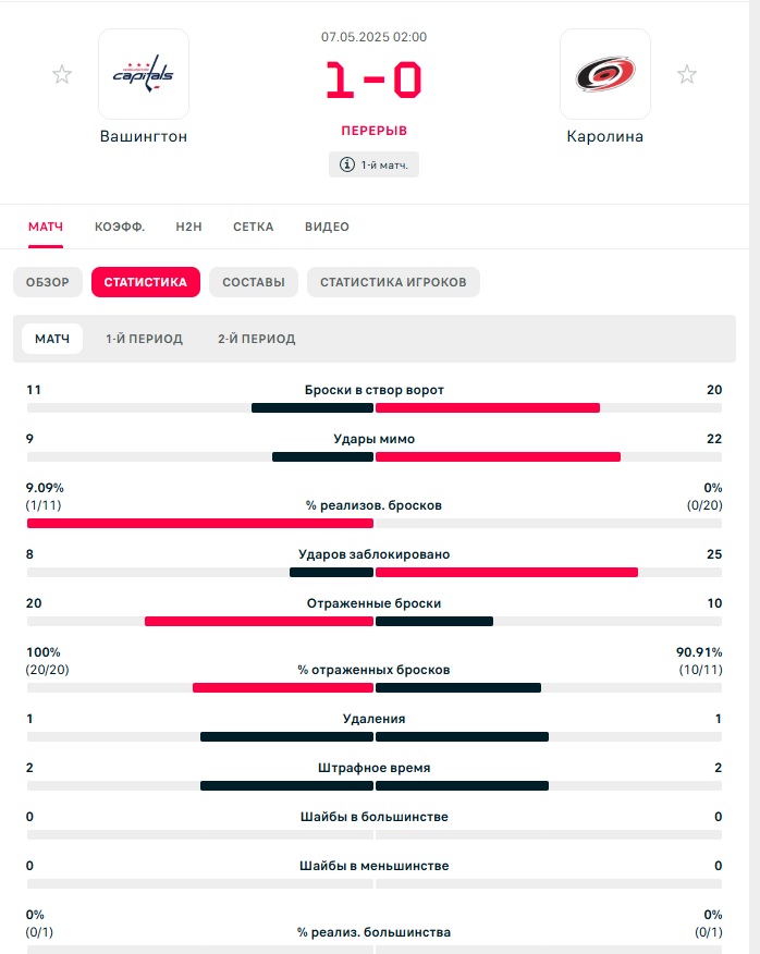 12’. При игре в равных составах «Каролина» выглядит интереснее. Пока «Вашингтону» больше обороняться приходится.