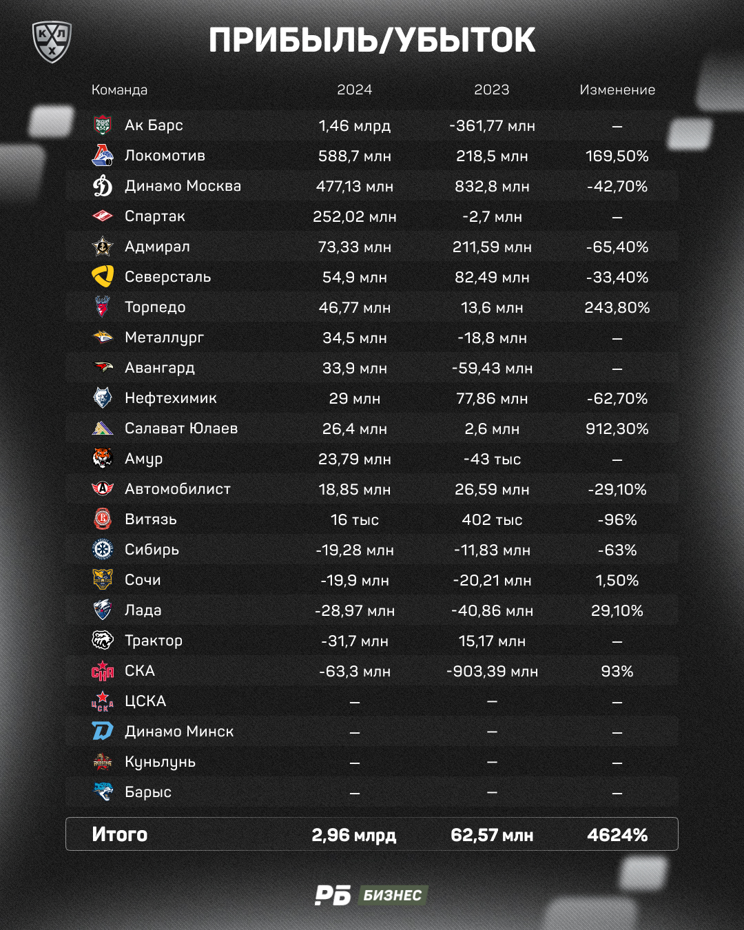 Единственным клубом, который «в плюс» на сумму в более миллиарда рублей, стал казанский «Ак Барс». Даже близко к казанцам по этому показателю в 2024 году никто подобраться не смог. Интересно, что в 2023-м «Ак Барс» был убыточным – именно тогда клуб в последний раз выходил в финал Кубка Гагарина.