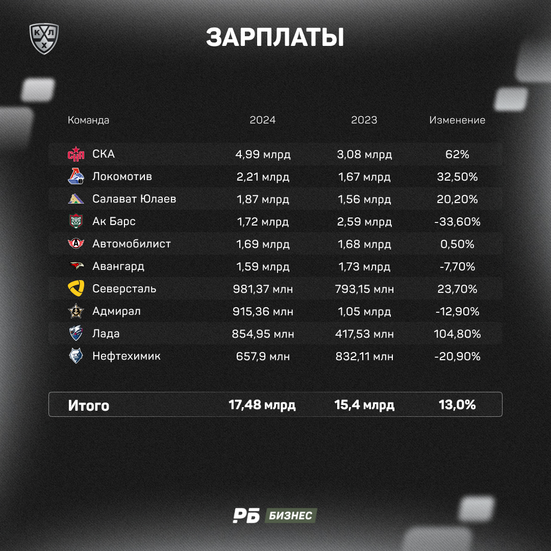 Так вот, лидером по зарплатам стал питерский СКА. У клуба огромная хоккейная структура с командой ВХЛ и двумя командами в МХЛ. Поэтому такой расклад не выглядит невероятным. За прошлый год юрлицо хоккейного СКА потратило на зарплаты 5 млрд рублей: почти на 2 млрд больше, чем в 2023-м.