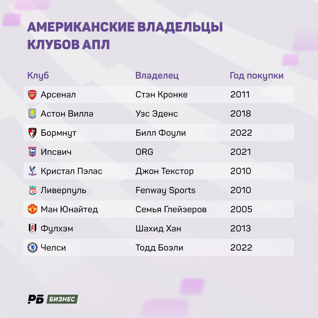 Еще шесть клубов принадлежат бизнесменам из Великобритании и по одному предпринимателям из Греции, Китая, Таиланда, ОАЭ и Саудовской Аравии.