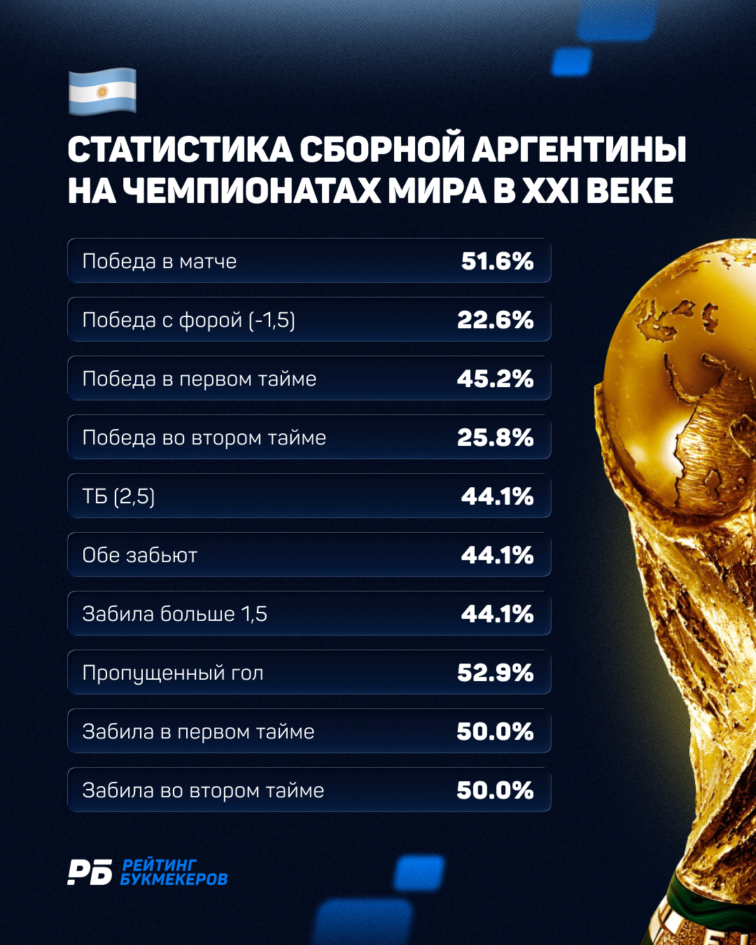 Ничего выходящего из ряда вон в результатах Аргентины на мундиалях нет. Отметим рынок «победы в 1-м тайме», который сыграл в 45% случаев, а коэффициент на него обычно высокий. Кроме того, в 53% матчей аргентинцы пропускали, что тоже стоит взять на заметку, проводя анализ матчей ЧМ-2026.