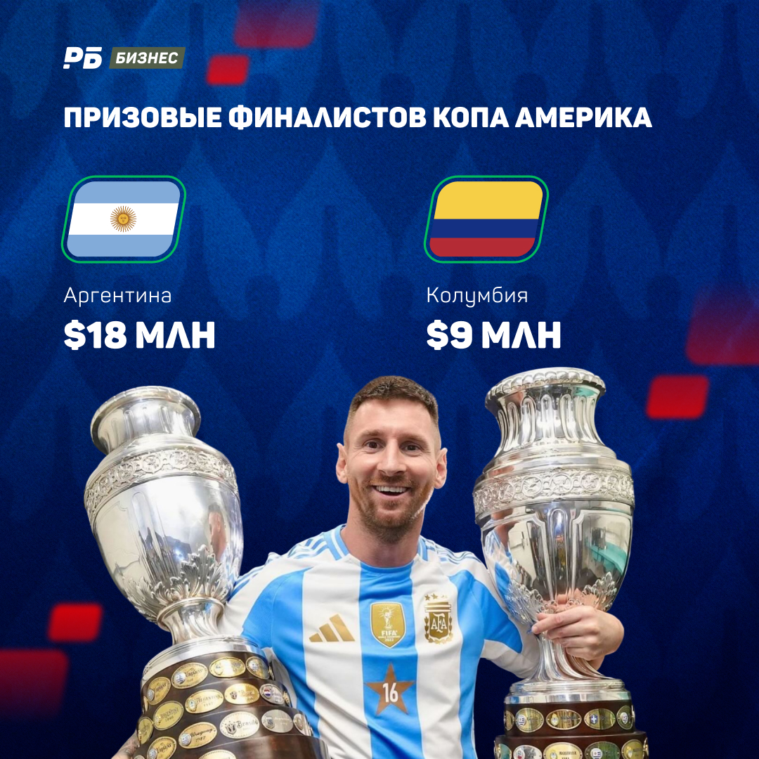 За проход финал Аргентина и Колумбия получили по $2 млн сверху. Получается так, что серебряный медалист Копы заработал призовых на турнире меньше, чем худшая команда Евро. Зато победитель получил Копы щедрые $18 млн. В то же время у испанцев, взявших Евро, €28,25 млн ($30,7 млн).