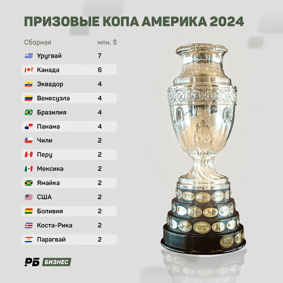 Общая сумма призовых на Копе — $72 млн. На Евро-2024 разыгрывали €331 млн, но на этом турнире команд было тоже больше (24 против 16).Сохрани РБ в избранное