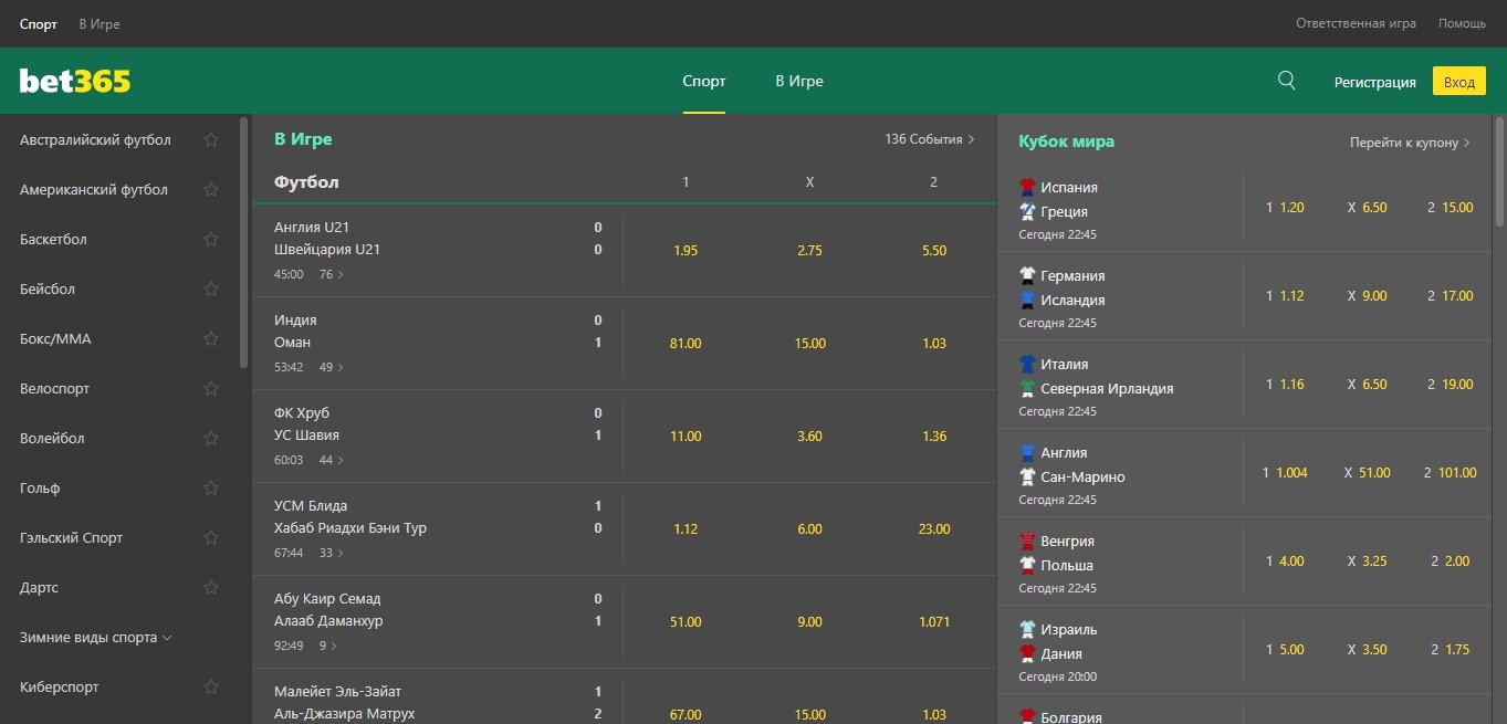 Особых отличий от иностранной версии Bet365 я не увидел. Помимо исходов