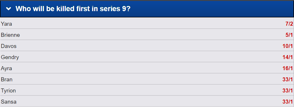Кроме того, Boyle Sports готова заключать пари на то, кто будет править Семью королевствами, а также на то, кто умрет в 9-м сезоне.