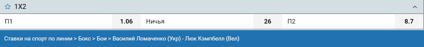 БК 1XСтавка оценивает шансы Ломаченко коэффициентом 1,06, что соответствует практически 100-процентной вероятности. Поставить на победу британца можно за 8,7. В процентах вероятности это 11%.