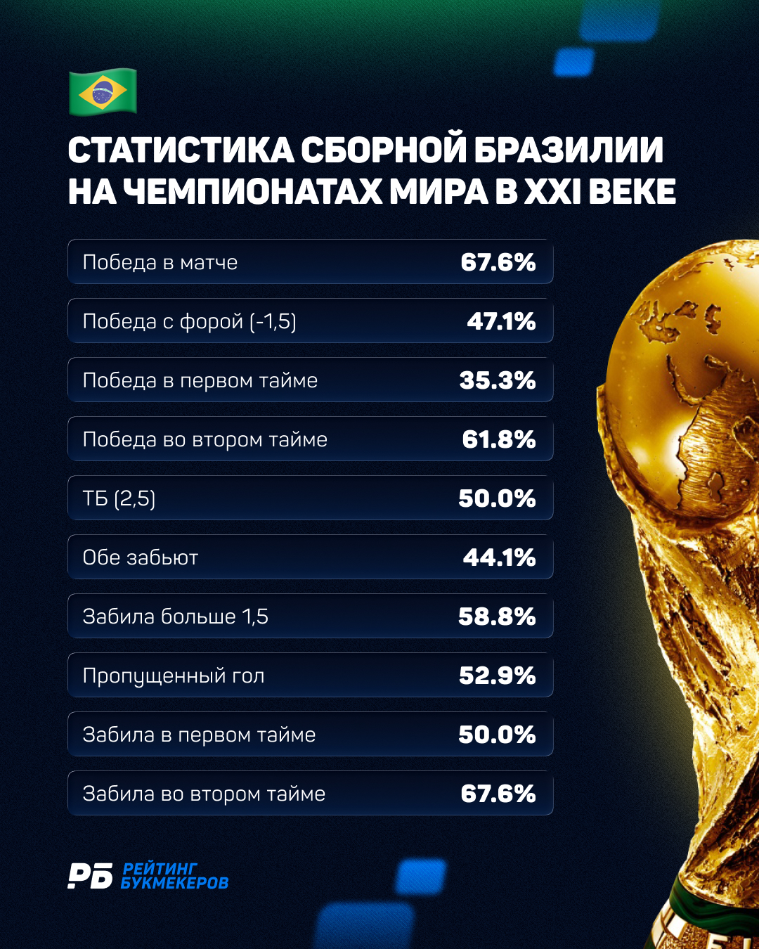 Самый высокий коэффициент на победу Бразилии на чемпионате мира в XXI веке был зафиксирован перед стартом ЧМ-2002, — 8,00. Тот чемпионат мира бразильцы выиграли.