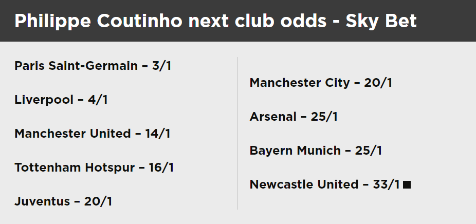 Интерес к Коутиньо проявляют сразу несколько известных клубов, включая «Пари Сен-Жермен» и «Манчестер Юнайтед». По мнению аналитиков БК SkyBet, наиболее вероятным вариантом для трансфера является именно «ПСЖ». Поставить на то, что Коутиньо перейдет в ряды парижан, можно за 4,0, что соответствует 25-процентной вероятности.