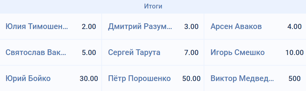 Помимо Тимошенко, в тройку фаворитов входят лидер партии «Слуга народа» Дмитрий Разумков, а также министр внутренних дел Украины Арсен Аваков. Букмекеры оценивают их шансы коэффициентами 3,0 и 4,0 соответственно. В процентах вероятности это 33% и 25%.