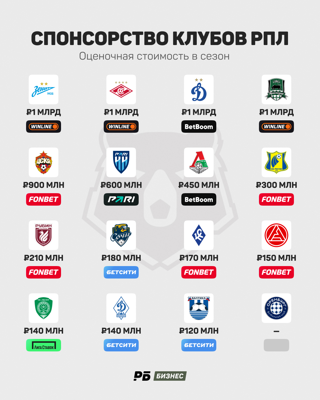 С целью наглядности влияния букмекерских компаний на главный футбольный турнир страны «РБ Бизнес» перенёс текущие контракты букмекеров с клубами на финансовую отчётность 2024 года и оценил потенциальную долю беттинга в доходах клубов.