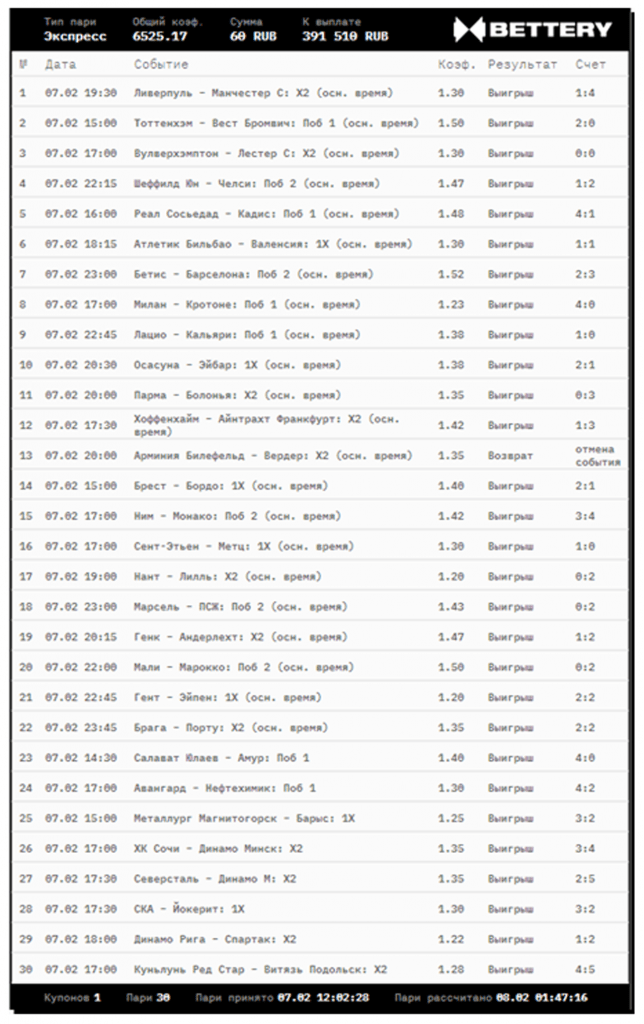 Игрок букмекерской компании Bettery сделал очень крутую ставку на прошлой неделе. Он собрал 30 событий из футбола и хоккея в один экспресс: суммарный коэффициент ставки был 6525,17! Поставил он, правда, не очень много, всего 60 ₽, но и этого было достаточно для получения потрясающей прибыли.