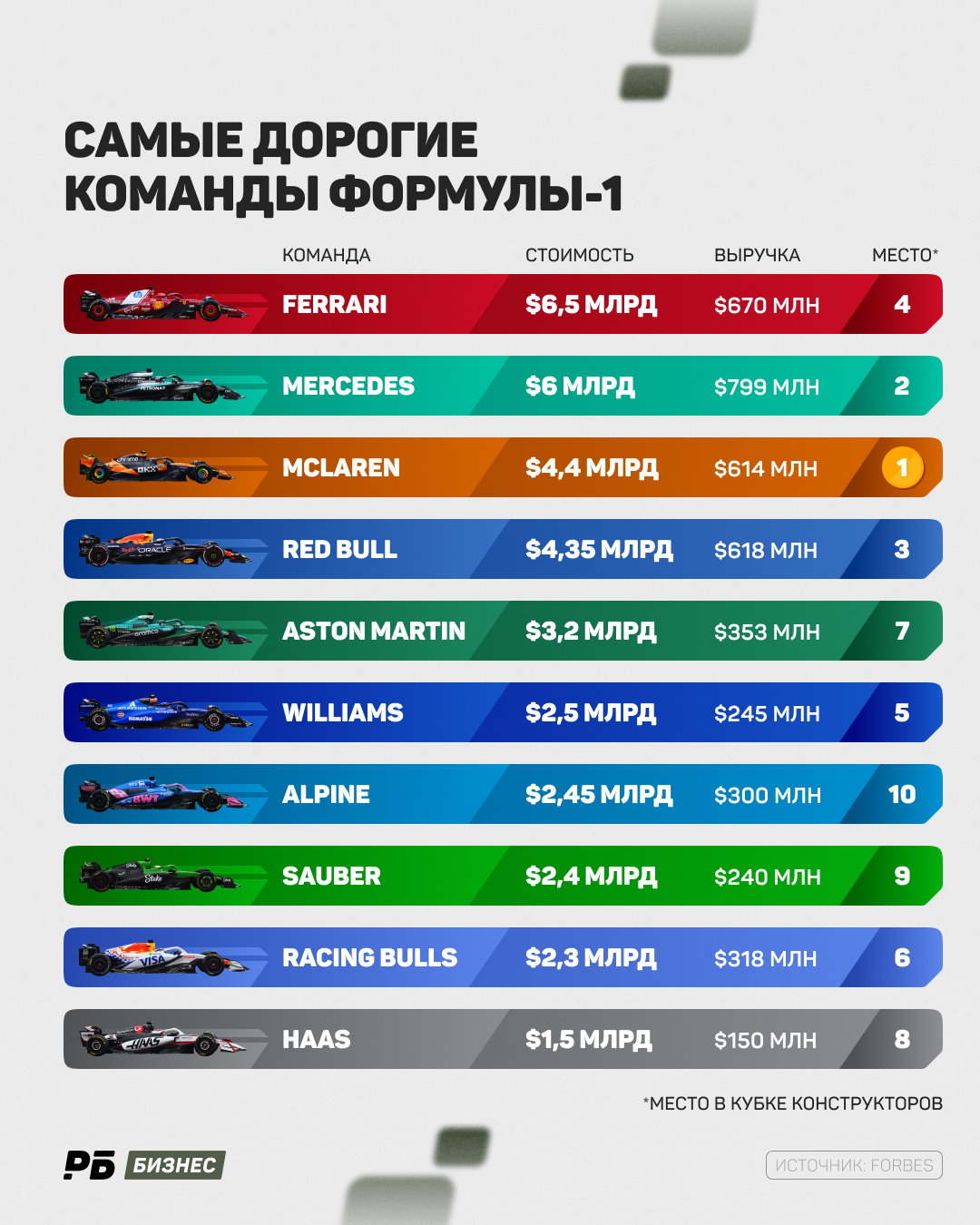 Как раз Mercedes, занявший второе место в этом рейтинге, остался без Хэмилтона, но взял на его место молодого Кими Антонелли. По стоимости Mercedes уступает итальянской команде всего на $500 тысяч.