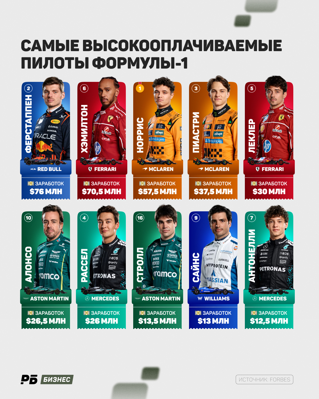 Может удивлять нахождение в топ-10 самых высокооплачиваемых гонщиков Лэнса Стролла из Aston Martin. За весь сезон он ни разу не попал даже в пятерку лучших в Гран-при. При этом его отец, Лоренс Стролл, является владельцем команды. К слову, по этой причине Aston Martin публикует в финансовой отчетности зарплату Стролла, но не раскрывает заработок второго пилота Фернандо Алонсо.