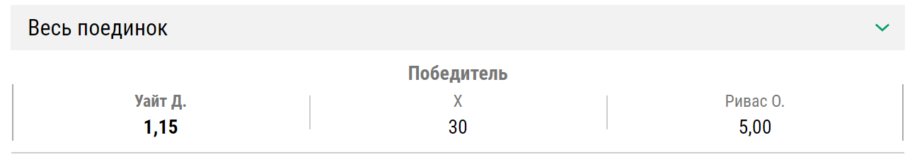 БК «Лига ставок» считает Уайта фаворитом боя и оценивает его шансы коэффициентом 1,15, что соответствует 86-процентной вероятности. Поставить на Риваса можно за 5,0. В процентах вероятности это 20%. Шанс ничьей оценивается коэффициентом 30,0 (вероятность 3%).