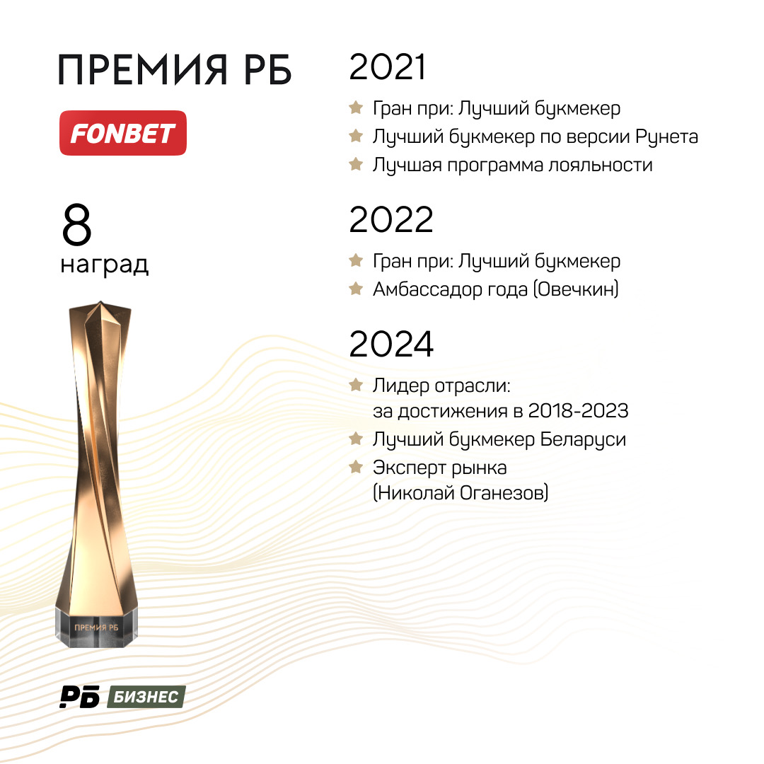 «Фонбет» – один из трех букмекеров, который признавался лучшим по итогам Премии РБ. Причем эту награду компания забирала дважды: в 2021 и 2022 годах. В этом году один из самых известных амбассадоров компании Александр Овечкин может «вечный» рекорд Уэйна Гретцки. Кстати, партнерство «Фонбета» и Овечкина уже признавалось лучшим – по итогам Премии-2022.