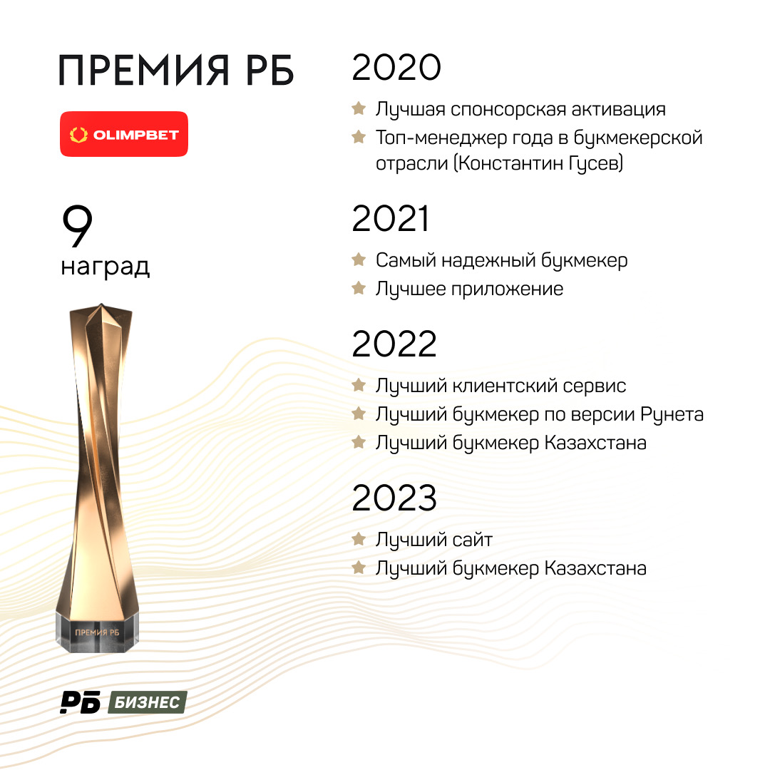 Самым успешным для букмекерской компании стал 2022 год: тогда Olimpbet забрал сразу три статуэтки. По итогам Премии РБ-2024 число побед сократилось до двух. Список всех номинаций, в которых побеждал Olimpbet, перечислять очень долго. Лишь одна номинация повторялась дважды: Лучший букмекер Казахстана (2022 и 2024).