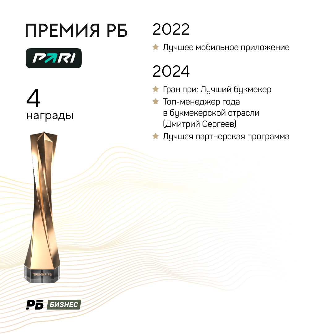 Букмекерская компания начала работу в 2022 году, поэтому приняла участие только в двух Премиях. Самой успешной для компании стала прошлая: тогда удалось забрать сразу три статуэтки. Тогда же PARI выиграл Гран-при: Лучший букмекер.
