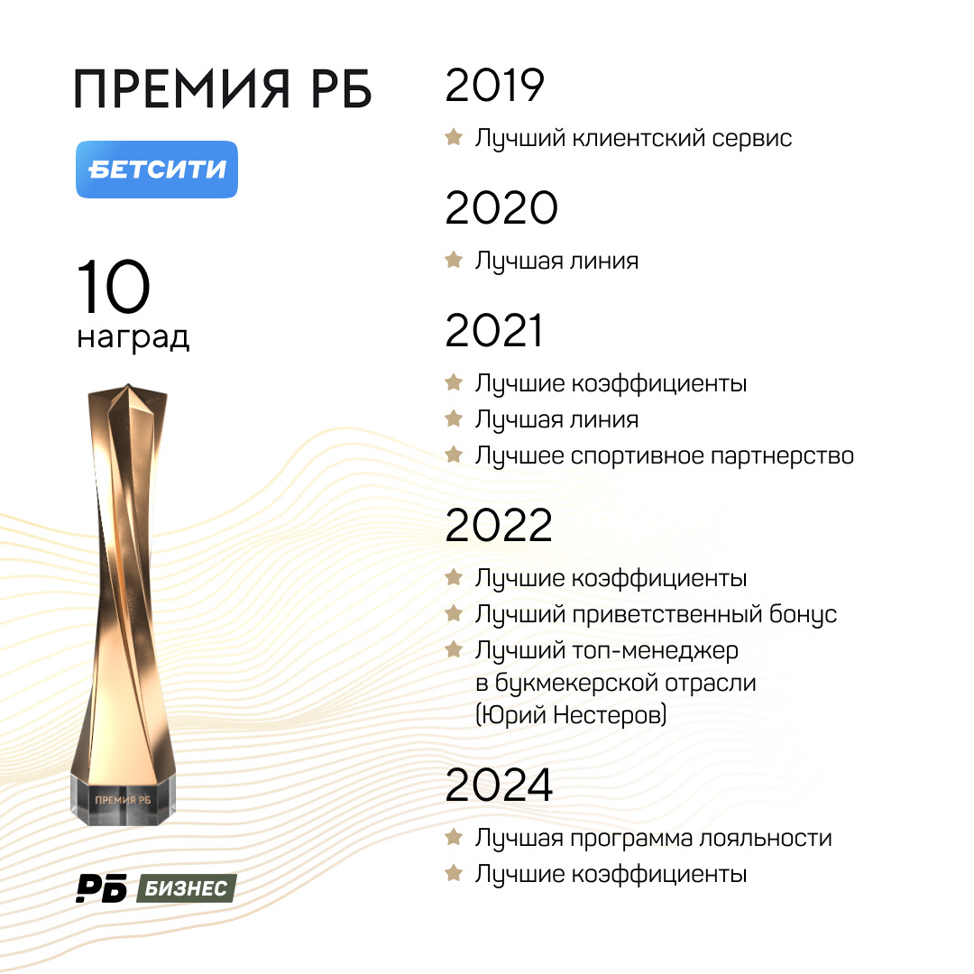 «Бетсити» участвовал в каждой из пяти Премий РБ. Самая успешная номинация для букмекера – Лучшие коэффициенты. В ней «Бетсити» одерживает победу три года подряд. С Премии РБ-2022 победитель в этой номинации определяется ODDS.ru