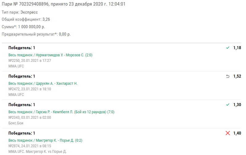 Игрок букмекерской компании «Лига Ставок» явно не будет спать спокойно в ближайшее время. Он сделал очень солидную ставку на 4 боя UFC с номиналом 1 000 000 ₽. Коэффициент был высоким – 3,26, и беттор ждал отличного выигрыша.
