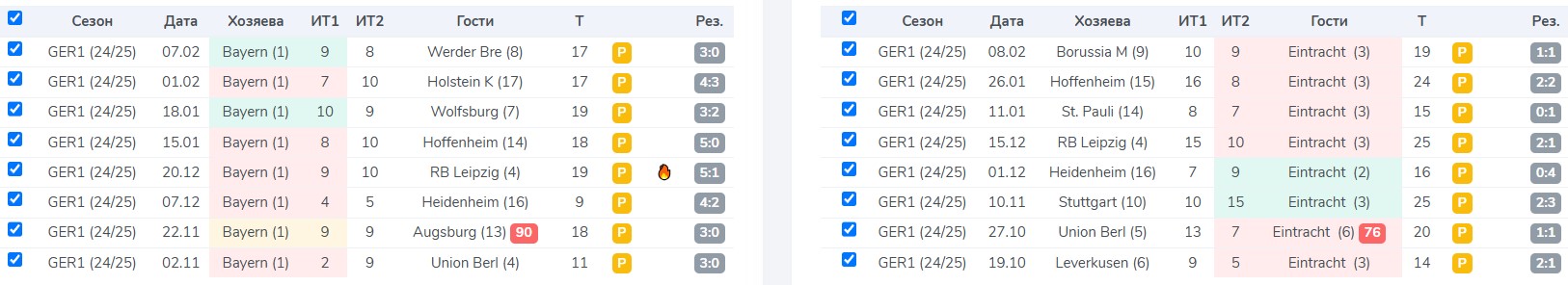 На Smart Tables есть отличный фильтр «дома/на выезде». С его помощью мы отсортировали игры команд по тому, где будет проходить встреча, и увидели, что в девяти из 10 последних подобных матчей у соперников «Баварии» было 10 или менее нарушений правил. У «Айнтрахта» в гостях ставка на ИТМ (10,5) фола зашла в семи из восьми игр.