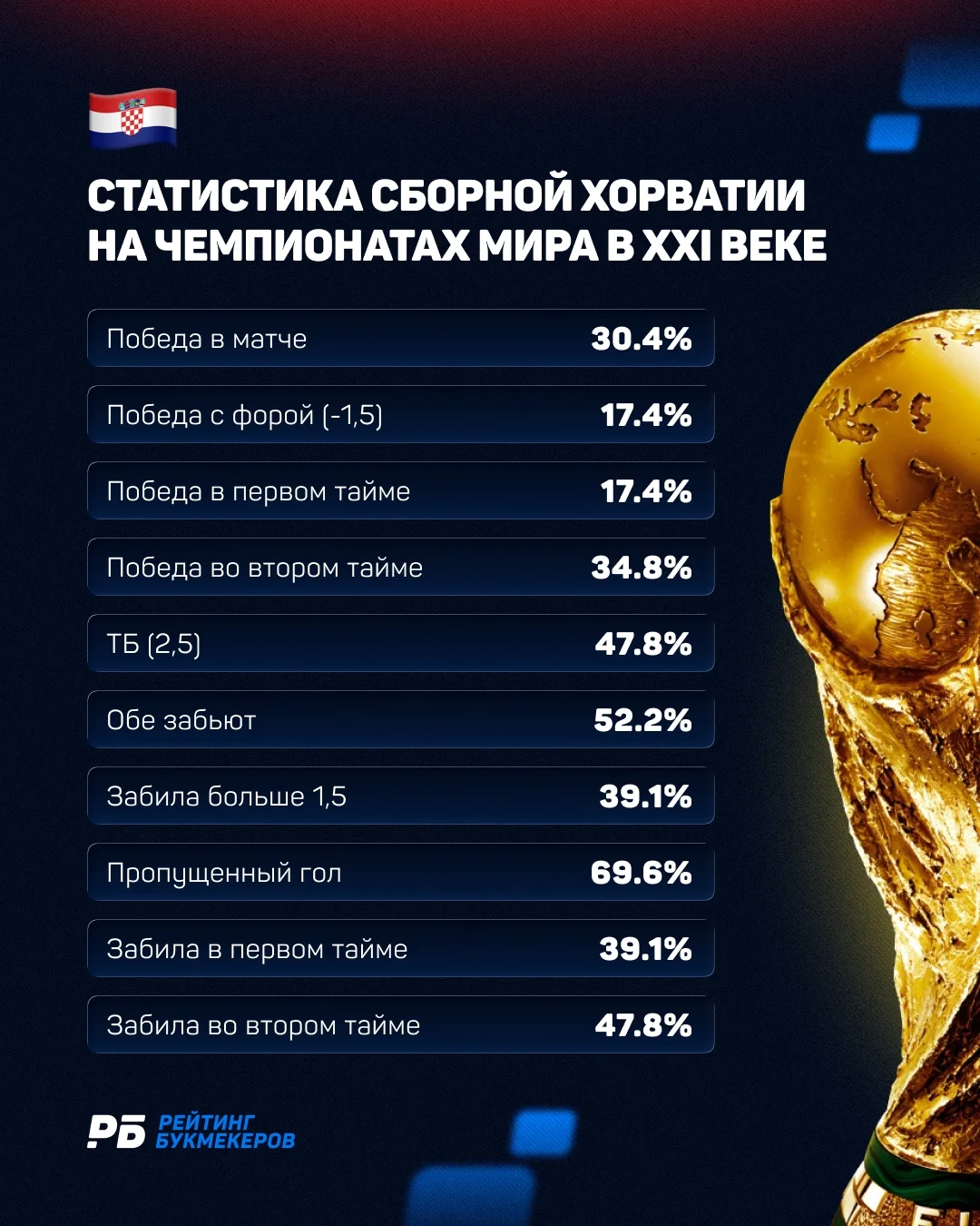 Лицо сборной Хорватии на чемпионатах мира можно описать всего двумя цифрами: 30% побед и 17% побед с форой (-1,5). И это команда, которая имеет две награды на шести последних мундиалях.