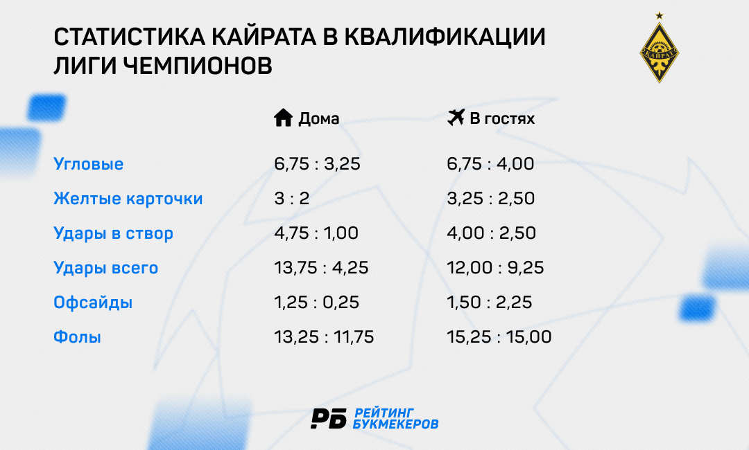 Из положительного: почти одно набранное очко в среднем за матч (0,97). То есть, в Алматы «Кайрат» даст бой мадридскому «Реалу», кипрскому «Пафосу», греческому «Олимпиакосу» и бельгийскому «Брюгге». Букмекеры уже сформировали линию на первую домашнюю игру «Кайрата» в ЛЧ-2025/26 против «Реала», и коэффициент даже на одно набранное очко достаточно высокий.