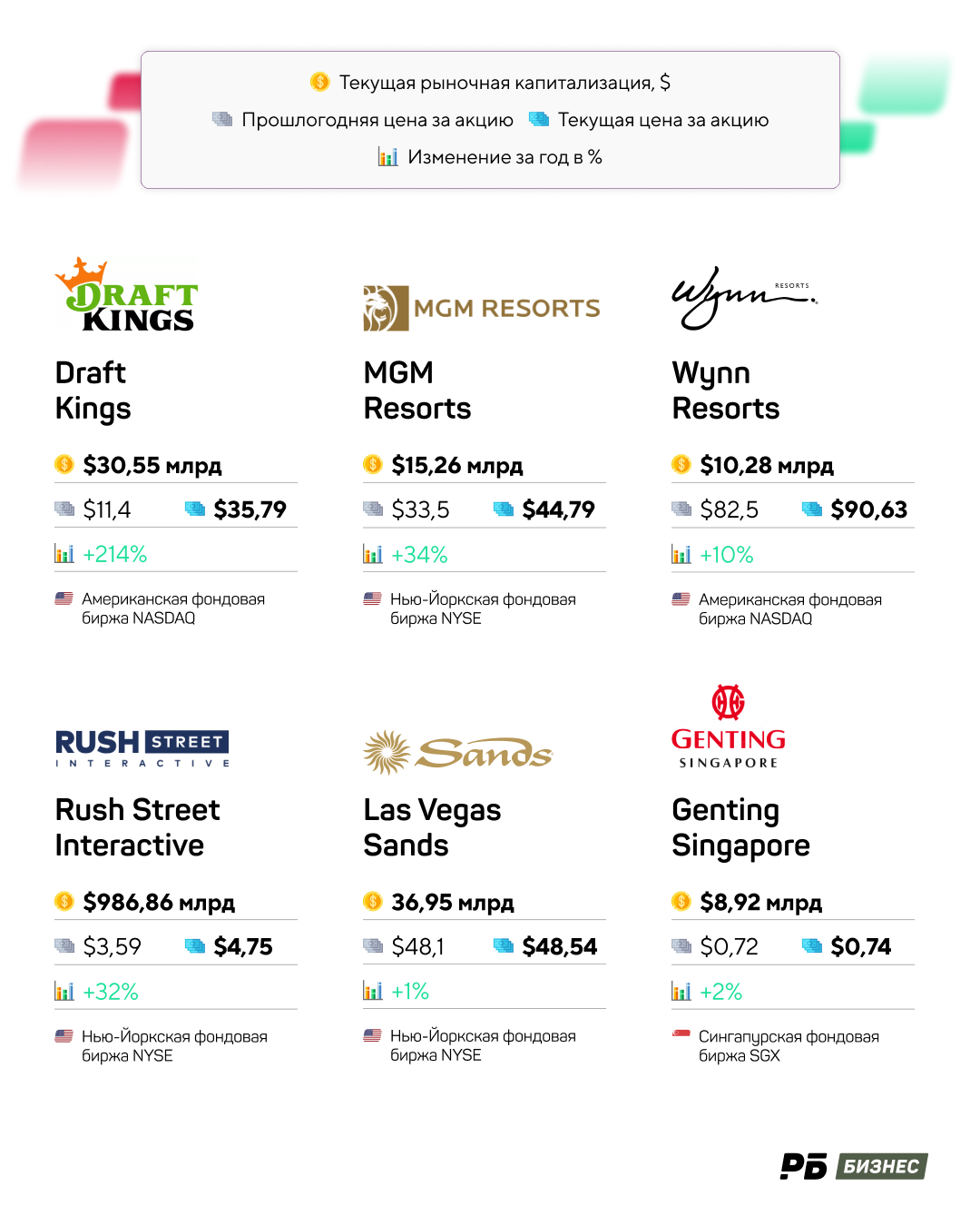 Также хорошо выросли бумаги MGM Resorts (казино Bellagio, Mandalay Bay, MGM Grand и Park MGM) (+34%), чей букмекерский бренд BetMGM летом запустился на рынке Великобритании, но не совместно с Entain, с которой MGM Resorts работает в Северной Америке, а на платформе шведского провайдера LeoVegas. Кроме того, на подобный рост повлияло снятие ковидных ограничений в Макао и приближении к легализации гемблинга в ОАЭ, где MGM строит свой интегрированный курорт.