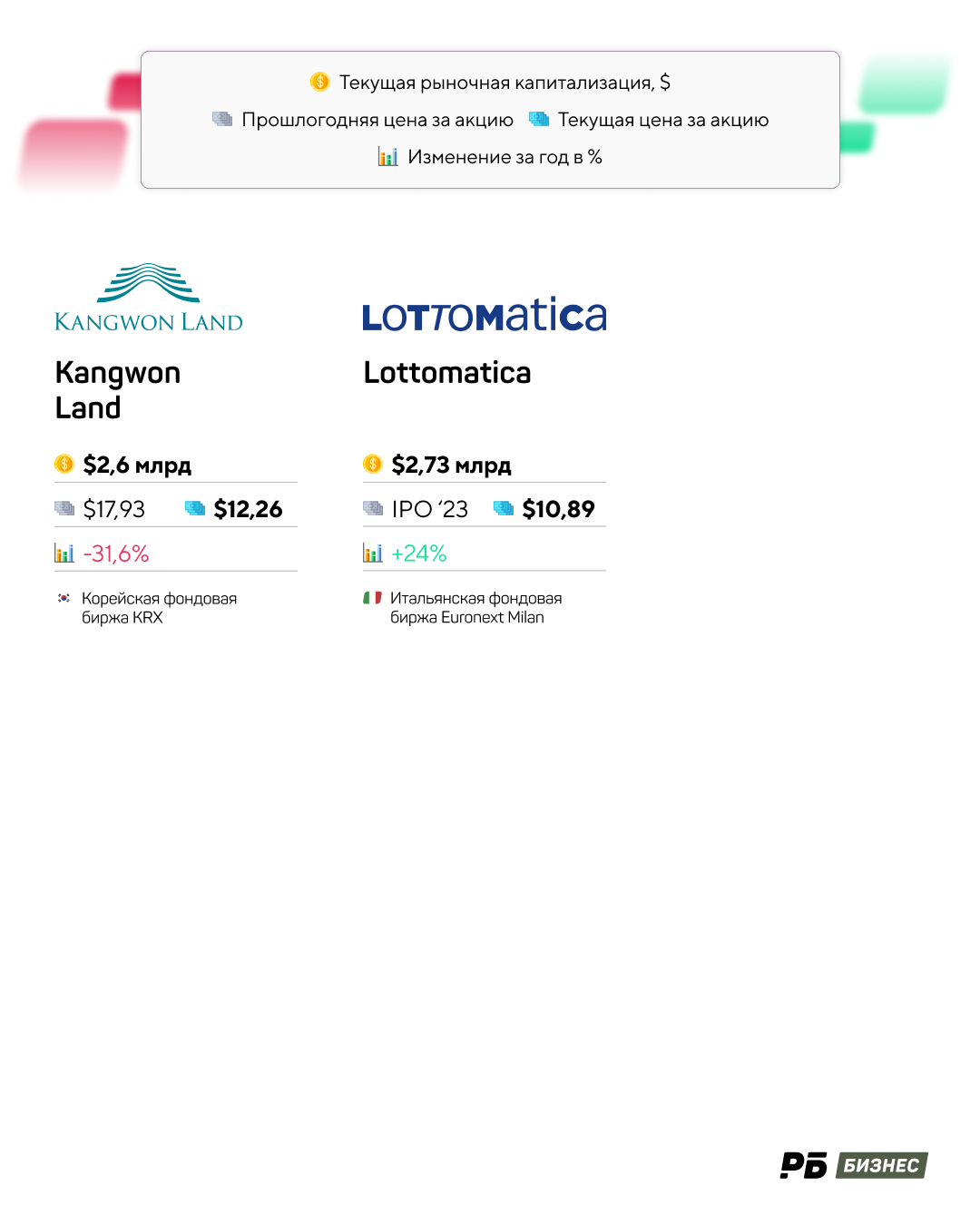 Южнокорейский государственный опертор Kangwon Land за прошедший год потерял почти треть (-31,6%) от стоимости своих акций на фоне убытка компании, который к концу 3 квартала превысил $1 млрд. В 2024 году Kangwon Land выйдет на рынок Филиппин в качестве поставщика игорного оборудования.