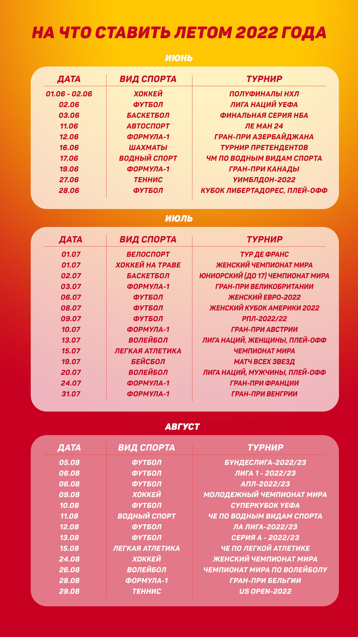 Чтобы не заблудиться в обилии турниров, предлагаем упорядочить наиболее крупных из них на лето 2022. Добавляем календарь спортивных событий в избранное, и сверяемся с ним каждый день.