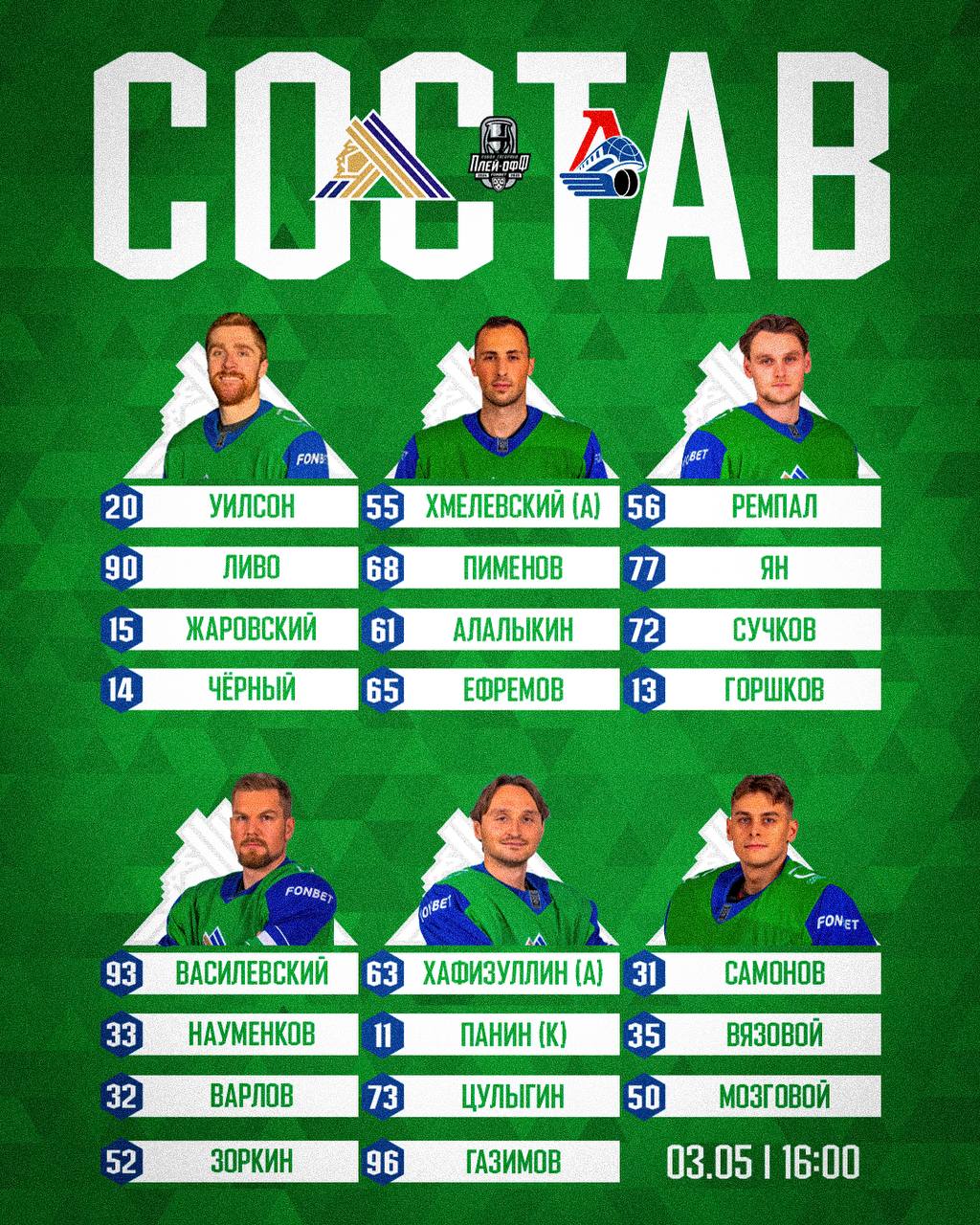 13:01. Изучаем! Состав «Салавата Юлаева» на игру. Ливо в обойме! В воротах не Вязовой, как до этого, а Самонов.