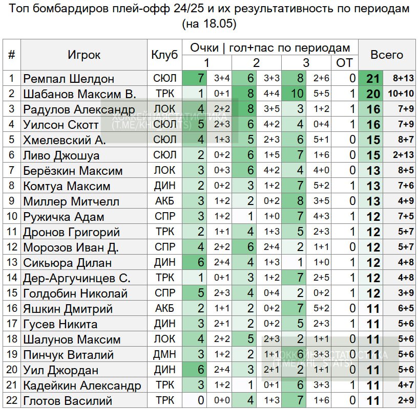 15:38. Еще немного хоккейной статистики от одноименного телеграм-канала. Бомбардиры плей-офф и их результативность по периодам.