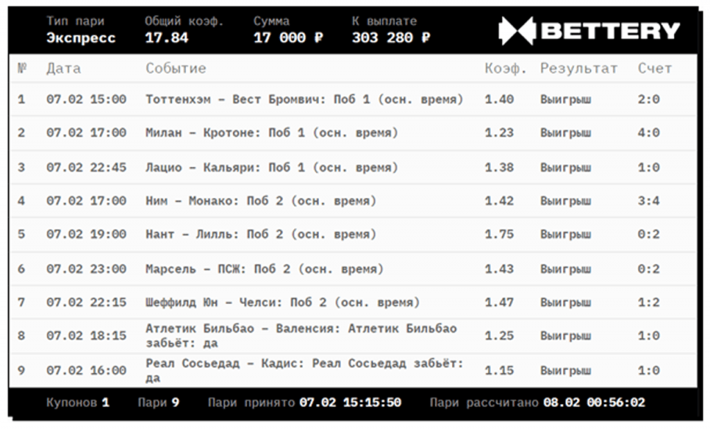 «Лилль» и ПСЖ уверенно переиграли своих оппонентов, а «Челси» пришлось нелегко, но и им удалось выиграть у «Шеффилд Юнайтед» со счетом 2:1. Оставались только голы «Атлетика» в ворота «Валенсии» и «Сосьедада» в ворота «Кадиса», с че команды успешно справились. Таким образом, игрок БК Bettery довез свой симпатичный экспресс и выиграл внушительную сумму: 303 280 ₽.