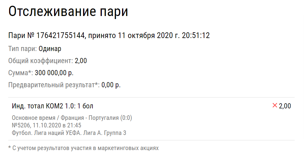 Беттор зарядил ₽300 тысяч на матч Франции с Португалией в Лиге наций, который прошел 11 октября. Он сделал ставку на то, что португальцы забьют больше одного гола. Букмекер принял пари по коэффициенту 2,0. Это значит, что в случае победы игрок получил бы ₽600 тысяч.