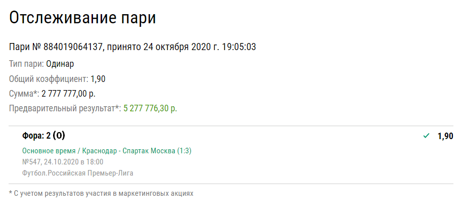 Минувшие выходные стали поводом для радости одного из пользователей БК «Лига Ставок». Игрок сделал ставку с огромным номиналом – 2 777 777 ₽ – на победу московского «Спартака» с нулевой форой в гостевом матче против «Краснодара» с коэффициентом 1,9. Видимо, уже в сумму пари была заложена доля удачи, учитывая количество семерок. Интересно, что прогноз был оформлен в лайв-режиме – ставка была принята спустя пять с небольшим минут после стартового свистка.