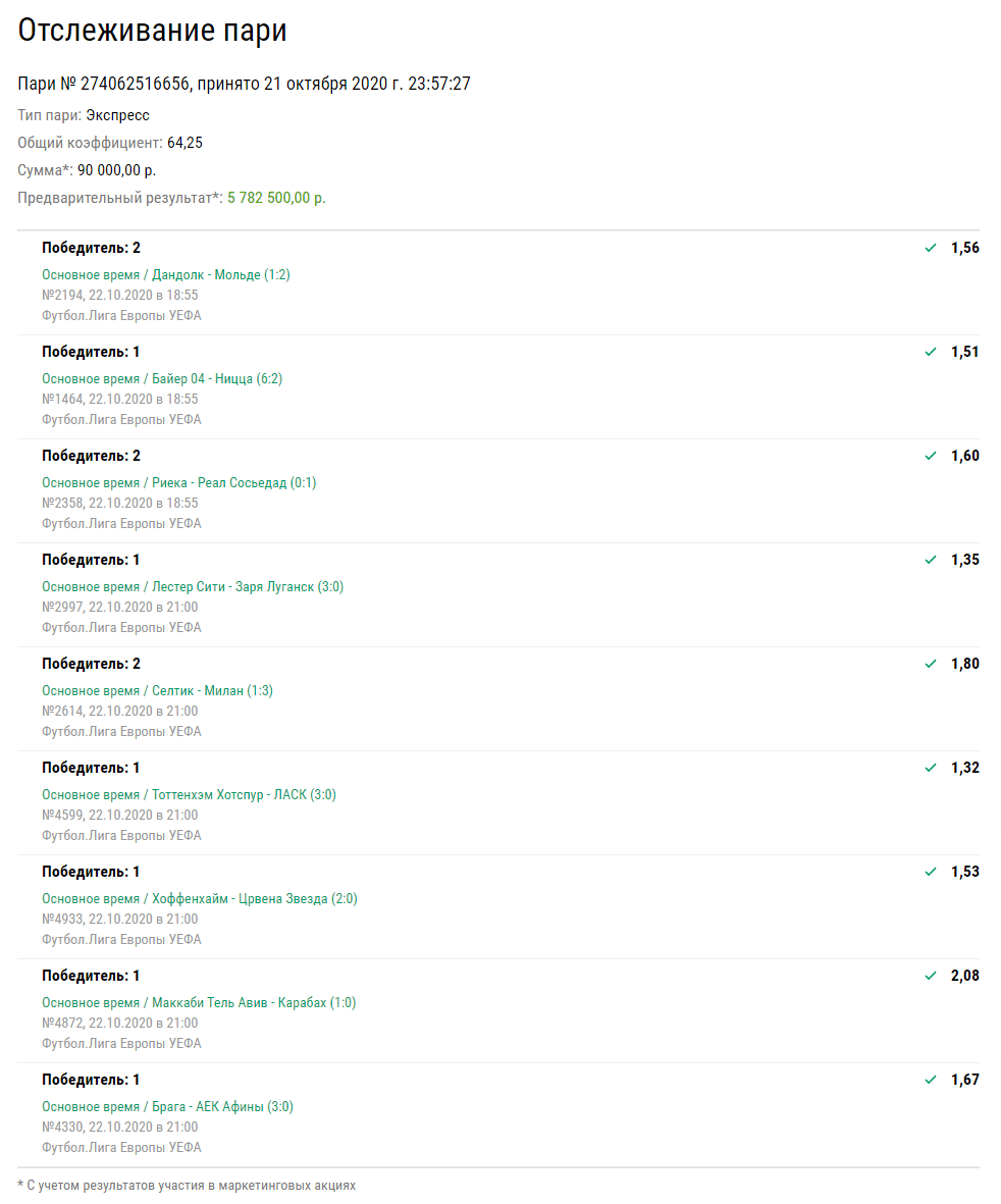 Но все прошло для автора ставки идеально. «Байер» уничтожил «Ниццу» со счетом 6:2, «Лестер» разгромил «Зарю» 3:0, «Милан», «Тоттенхэм», «Брага» и «Хоффенхайм» тоже одержали убедительные победы. «Маккаби» выиграл у «Карабаха» с минимальным преимуществом. В самом начале нервы потрепал «Мольде», который проигрывал к 60-й минуте 0:1. Но команда смогла перевернуть ход игры за 10 минут и к 72-й минуте установила окончательный счет 2:1.