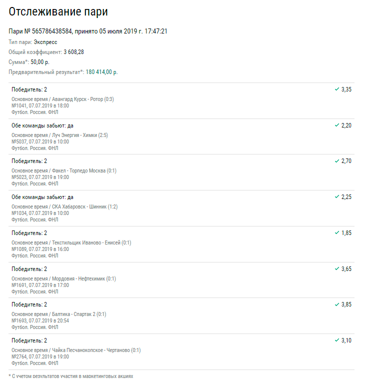Помимо ставок на победителя, беттер поставил на то, что обе команды забью в матчах «Луч-Энергия» — «Химки» и СКА «Хабаровск» — «Шинник». Минимальный коэффициент в экспрессе составлял 1,85, а максимальный — 3,85. Суммарный коэффициент экспресса составил 3 608,28, принеся удачливому игроку выплату в размере ₽180 тыс.