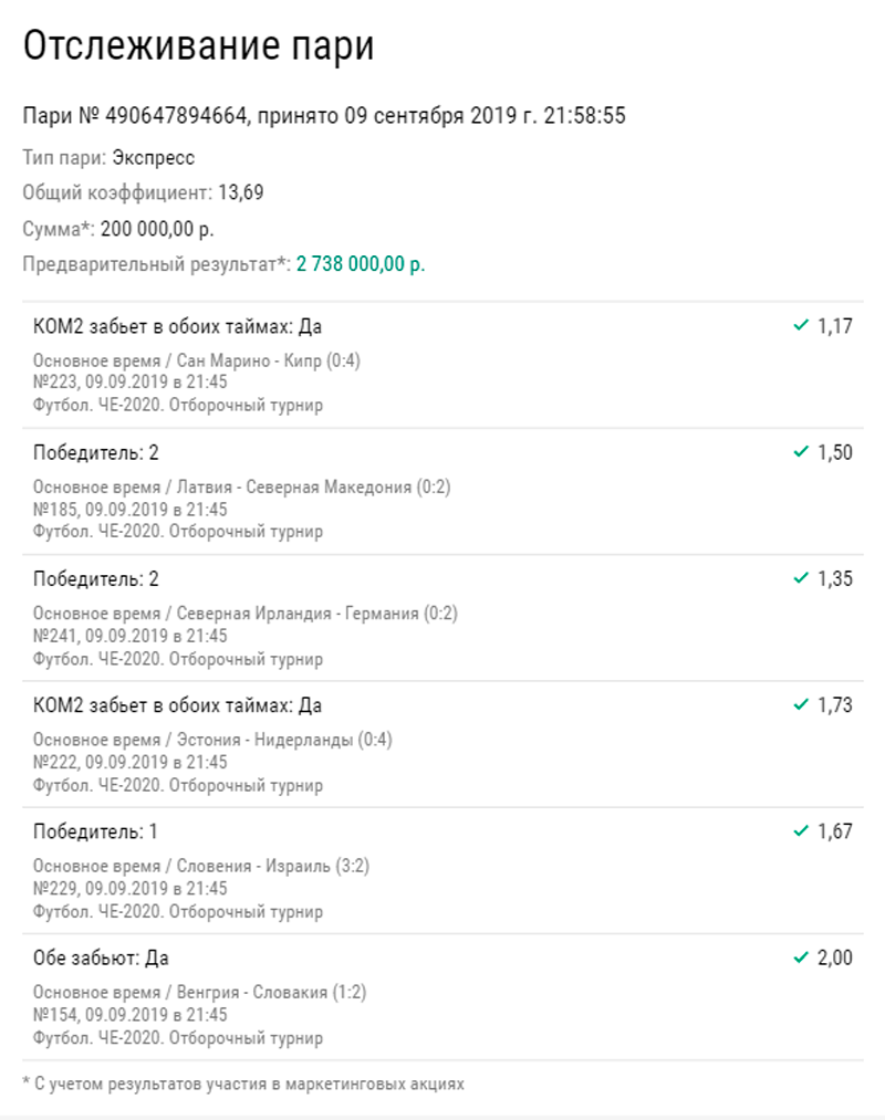 В большинстве событий игрок выбрал ставки на победителя, а также поставил на «обе забьют» и на то, что команда забьет в обоих таймах. Самый низкий коэффициент составил 1,17 (матч Сан Марино — Кипр), а самый высокий — 2,0 (матч Венгрия — Словакия). Суммарный коэффициент экспресса составил 13,69.
