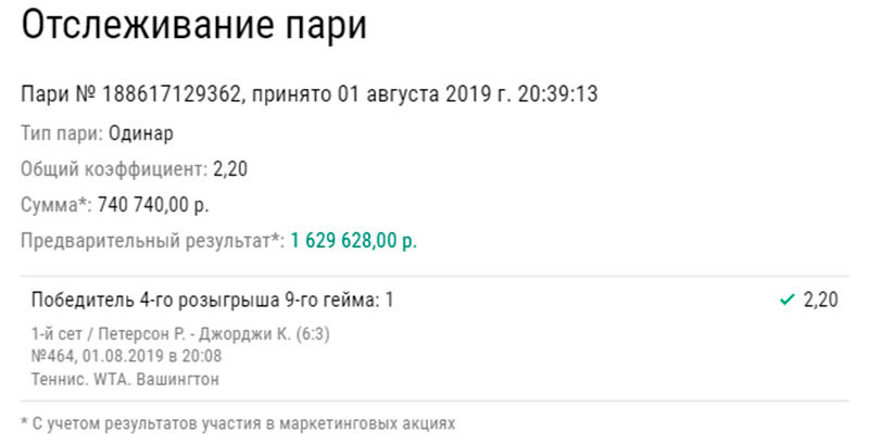 Первый беттер поставил на теннисный матч Citi Open между Ребеккой Петерсон и Камилой Джорджи. ₽740 тыс. пошли на то, что Петерсон победит соперницу в 4-м розыгрыше 9-го гейма по коэффициенту 2,2. Несмотря на то, что по итогам матча шведская спортсменка уступила итальянке, ей удалось принести удачливому игроку выигрыш в размере ₽1,6 млн.