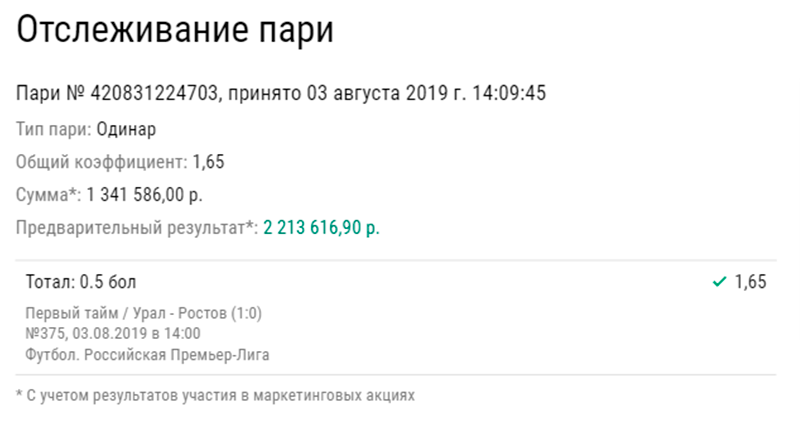 Второй игрок выбрал матч «Урал» — «Ростов», поставив ₽1,3 млн на «тотал больше 0,5» в первом тайме по коэффициенту 1,65. В итоге ставка сыграла уже на 14-й минуте матча, когда игрок «шмелей» Андрей Панюков открыл счет, забив первый гол в ворота соперника. Беттер получил выплату в размере ₽2,2 млн.