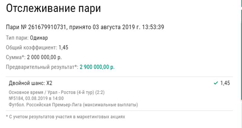 Третий игрок также ставил на матч «Урал» — «Ростов», однако выбрал менее рискованную ставку с коэффициентом 1,45. Он зарядил ₽2 млн на двойной шанс - на ничью или победу «Ростова». Соперники разошлись миром - счет 2:2, - принеся игроку выплату в размере ₽2,9 млн.