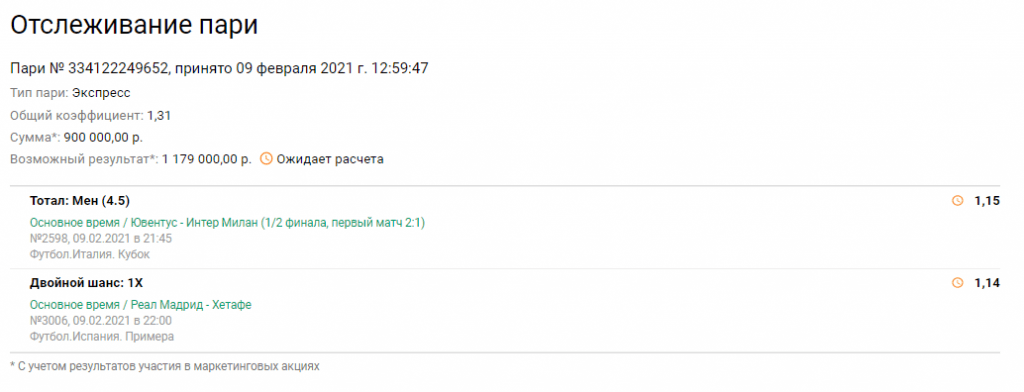 Букмекерская компания «Лига Ставок» обнародовала информацию о самой крупной ставке сегодняшнего дня. Один из игроков решил сделать двойник на футбол. Риск минимален с точки зрения коэффициента, но сумма ставки не может не впечатлять. Взгляните на купон: