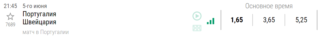 В сегодняшнем матче букмекеры считают фаворитами португальцев. Так, БК «Лига ставок» оценивает шанс победы Португалии коэффициентом 1,65, что соответствует 60-процентной вероятности. Поставить на Швейцарию можно за 5,25. В процентах вероятности это 19%.