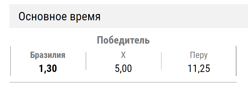Аналитики не ждут от соперников результативной игры. На рынке «тотал 2,5» вариант «больше» оценивается коэффициентом 2,0 (50%). Поставить на «меньше» можно за 1,8 (55%). По мнению букмекеров, перуанцам не удастся забить ни одного гола в ворота соперника. Так, на рынке «сколько команд забьет» вариант «только первая» (Бразилия) оценивается коэффициентом 1,8 (55%). Поставить на «обе забьют» можно за 2,65 (37%).