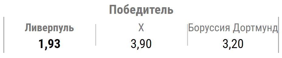 БК «Лига Ставок» считает фаворитом «Ливерпуль» и оценивает его шансы коэффициентом 1,93, что соответствует 51-процентной вероятности. Поставить на «Боруссию» можно за 3,2. В процентах вероятности это 31%.