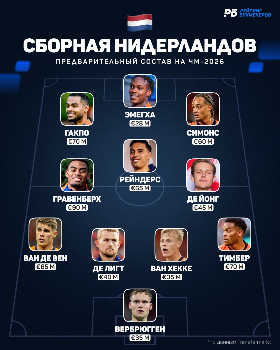 Куман играет по голландской классике — схеме 4-3-3 с акцентом на атаку (Нидерланды забили во всех матчах отбора). При этом, в составе Оранье есть два опорника хай-класса Равен Гревенберх и Фрэнки де Йонг, одинаково хороши, как на мяче, так и без него. Прибавьте сюда классные фланги в лице Дензела Дюмфриса и Юррьена Тимбера и получите прообраз Нидерландов на ЧМ-2026.