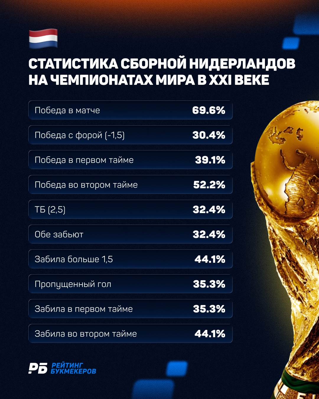 Голландцы — поставщики побед. Почти 70% игр сборной Нидерландов на чемпионатах мира с 2002 года заканчивались ее победами. Среди других цифр выделяются: