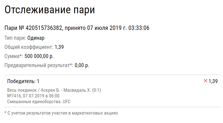 Тем не менее игроки, поставившие на Масвидаля, смогли получить неплохие выигрыши. Так, один из клиентов букмекера поставил ₽12 тыс. на экспресс из трех поединков UFC 239. Игрок разместил ставки на досрочные победы в поединках Аскрен — Масвидаль, Рокхолд — Блахович и Нуньес — Холм.