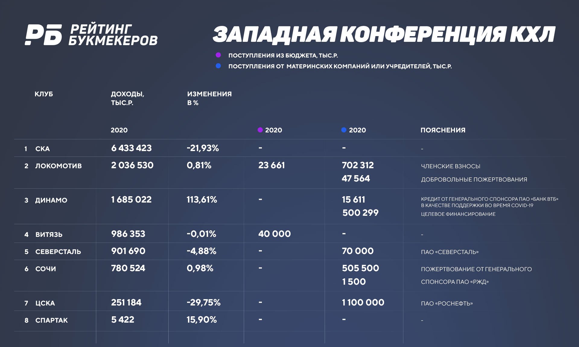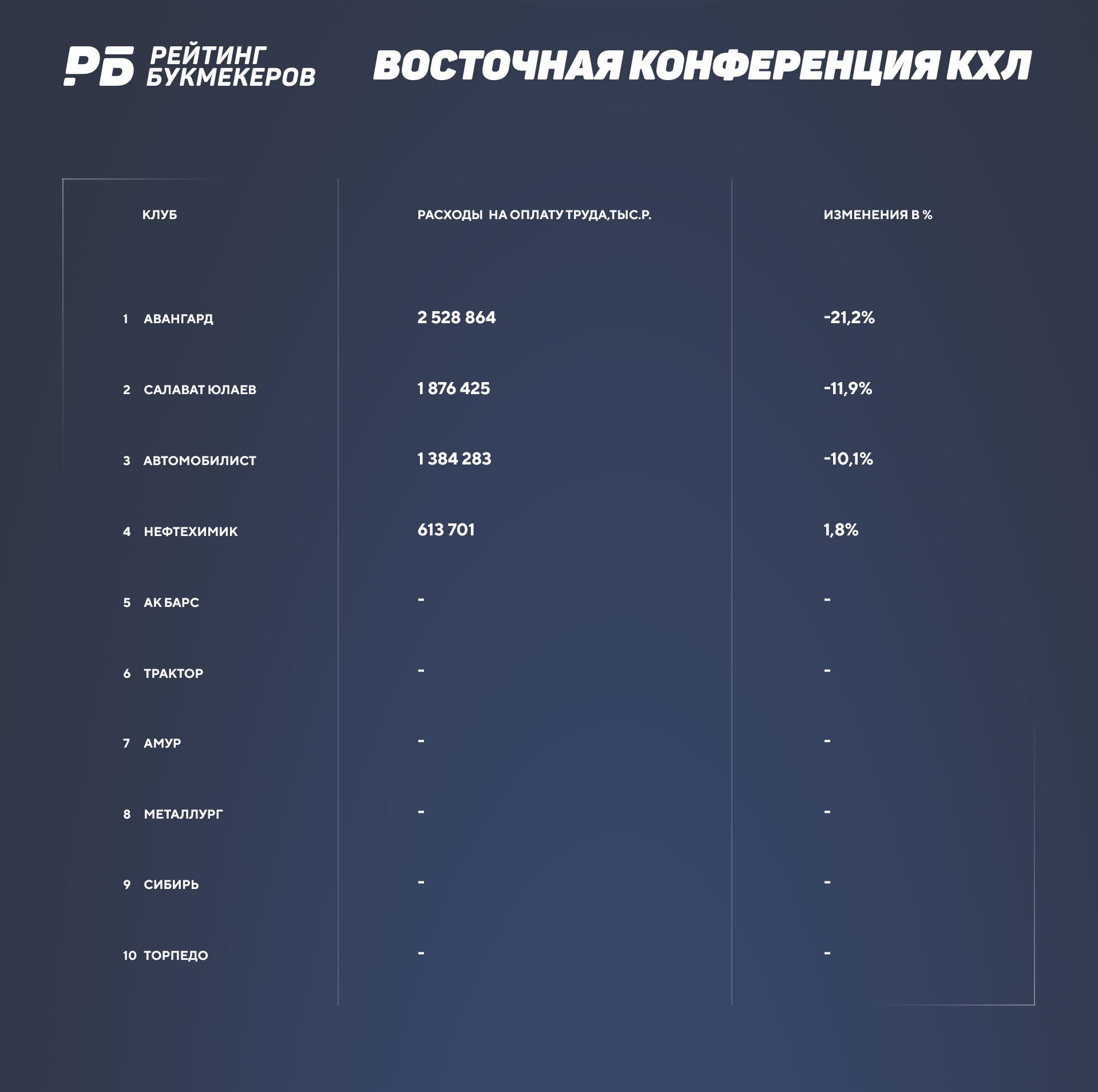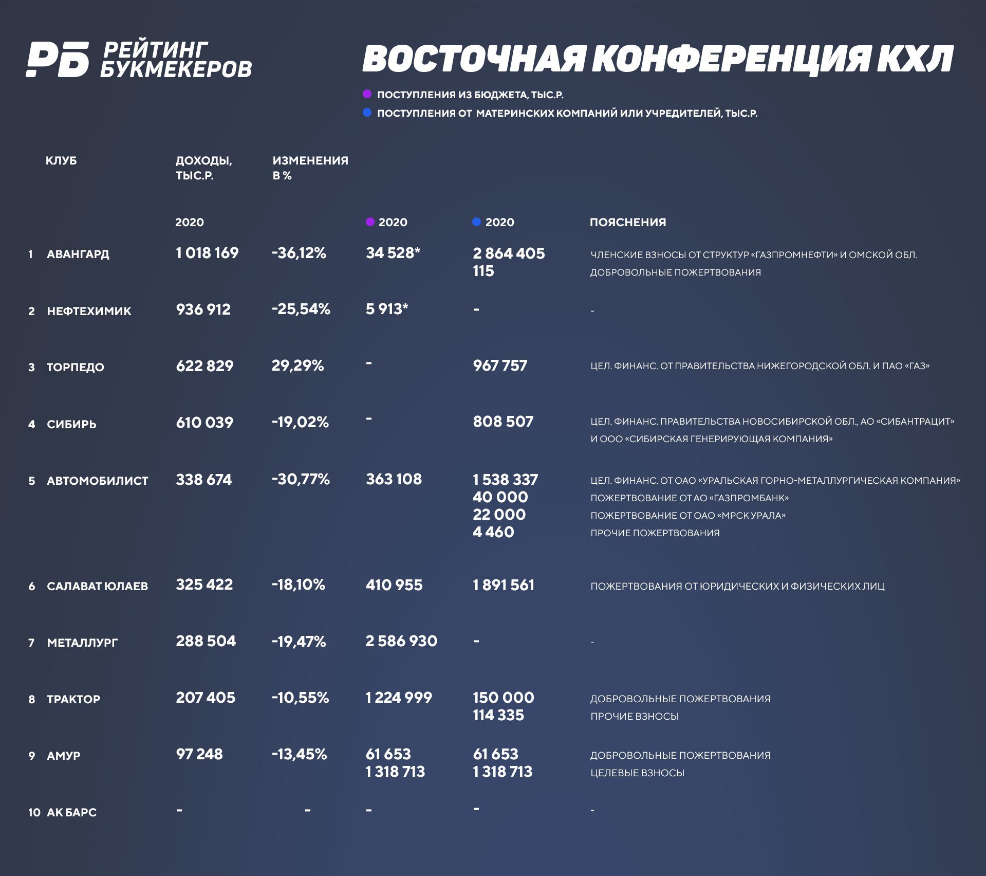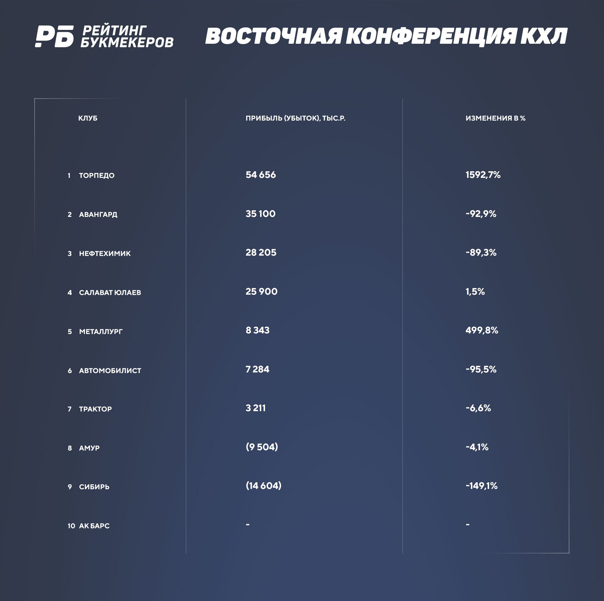 Среди клубов Восточной конференции размером чистой прибыли отличились «Торпедо» (54,7 млн рублей) и омский «Авангард» (35,1 млн рублей).