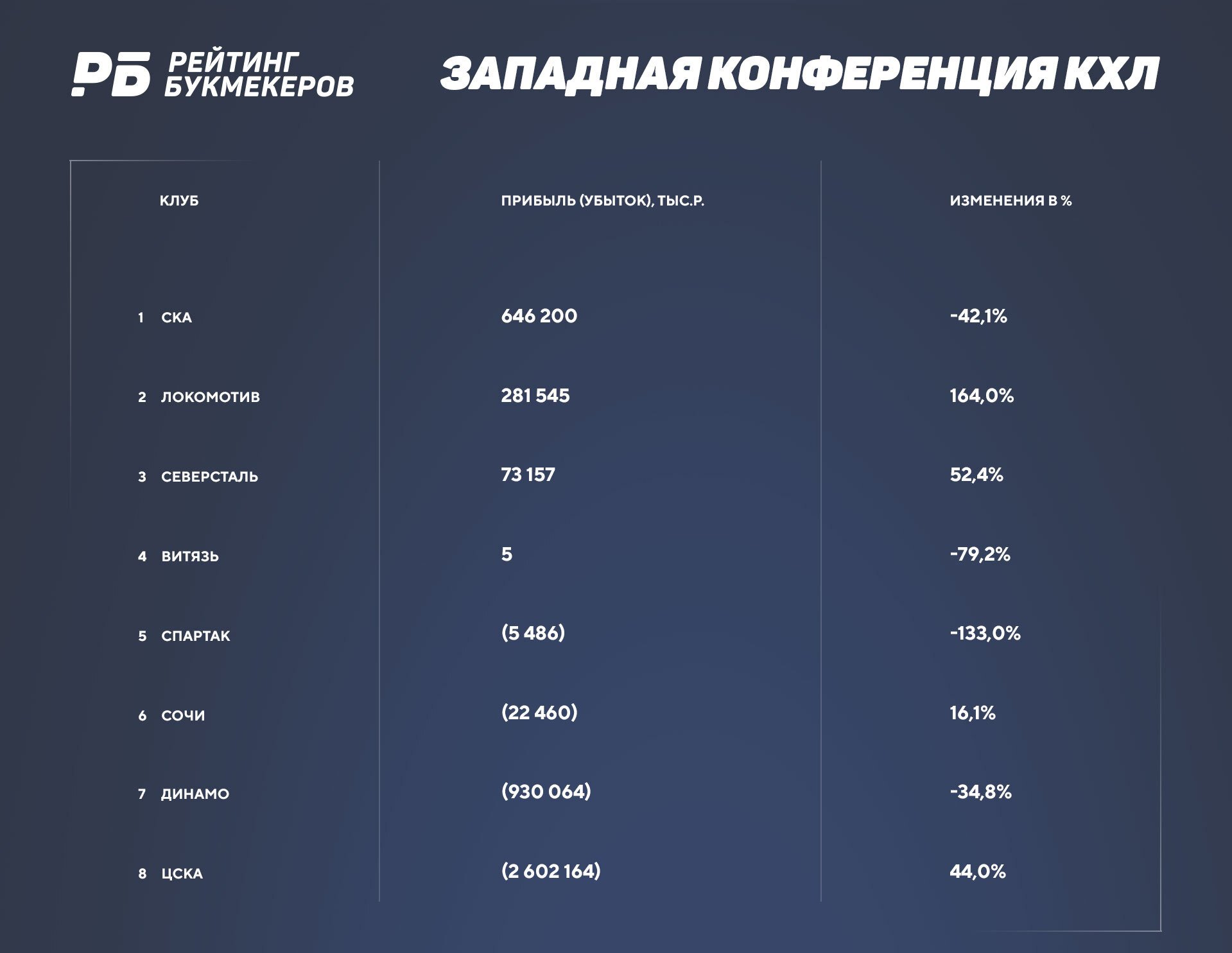 Петербургский СКА стал рекордсменом в части прибыли, несмотря на почти двукратное падение, отчитавшись о 646,2 млн. За ним следует ярославский «Локомотив» с прибылью в 281,5 млн рублей (+164%) и «Северсталь» с 73,2 млн (+52,4%).